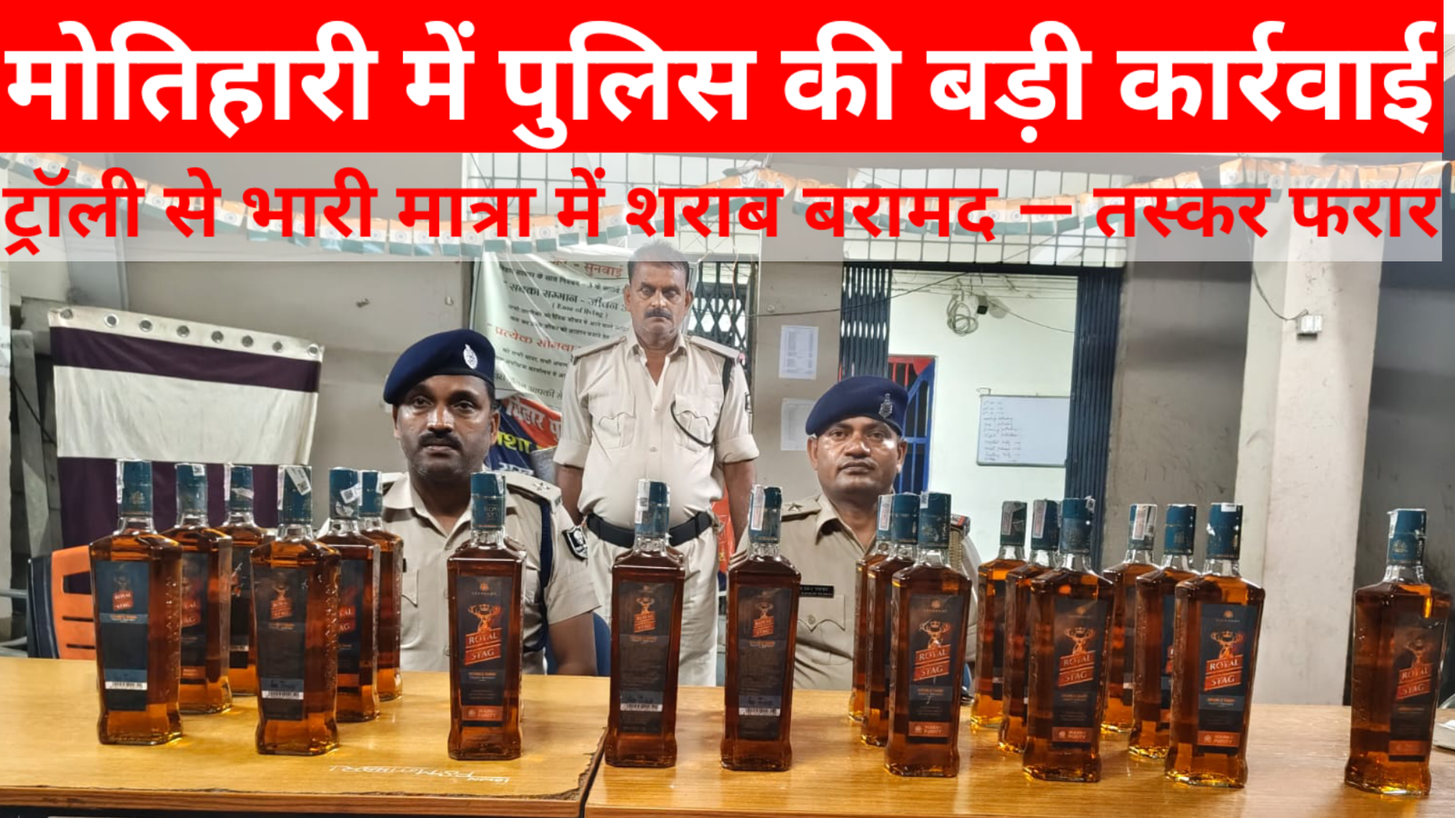 बिहार में पूर्ण शराबबंदी कानून लागू होने के बावजूद शराब तस्करी के मामले लगातार सामने आ रहे हैं। इसी कड़ी में पूर्वी चंपारण जिले के मोतिहारी नगर थाना पुलिस ने एक बड़ी कार्रवाई करते हुए भारी मात्रा में शराब बरामद की है। हालांकि पुलिस की इस कार्रवाई के दौरान शराब तस्कर अंधेरे का फायदा उठाकर मौके से फरार होने में सफल रहे।