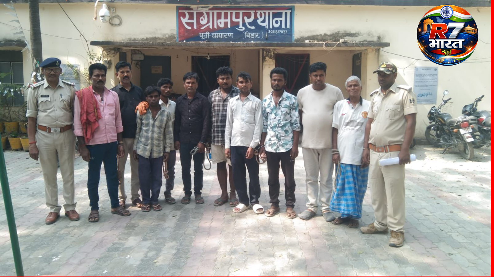 पूर्बी चंपारण र्जिले के संग्रामपुर थाना क्षेत्र में पुलिस ने अपराधियों और अवैध शराब कारोबारियों के खिलाफ बड़ी और सख्त कार्रवाई करते हुए इलाके में कानून व्यवस्था को लेकर अपनी सक्रियता का स्पष्ट संदेश दिया है। थानाध्यक्ष अनूप कुमार के नेतृत्व में चलाए गए विशेष छापेमारी अभियान के दौरान पुलिस टीम ने अलग-अलग मामलों में कुल 10 अभियुक्तों को गिरफ्तार करने में सफलता हासिल की है। इस कार्रवाई के बाद क्षेत्र में अपराधियों और अवैध कारोबार से जुड़े लोगों के बीच हड़कंप मच गया है।