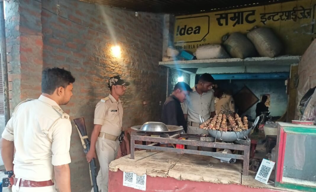हरसिद्धि गायघाट चौक पर भुजा मीट दुकान में छापेमारी करती उत्पाद पुलिस
