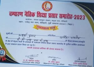 मोतिहारी जिला मुख्यालय स्थित नगर भवन के सभागार में चंपारण नैतिक शिक्षा प्रसार समारोह का आयोजन किया गया कार्यक्रम का शुभारंभ महापौर प्रीति कुमारी, डॉ सीएल झा, प्रोफेसर कर्मात्मा पांडेय संयुक्त रूप से किया समारोह को सम्बोधित करते हुए सम्मान समारोह के अध्यक्ष कर्मात्मा पांडेय ने कहा कि व्यवहार ऐसा करना चाहिए जिसके अनुकरण करने से सबके हित की रक्षा हो सके नैतिक ज्ञान व शिक्षा समाज के प्रत्येक व्यक्ति के हित की प्रेरणा देता है।