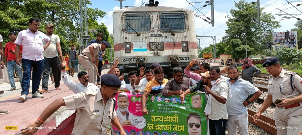 मोतिहारी बिहार में शिक्षक बहाली में डोमिसाइल नीति लागू करने , बिहार के बंद पड़ी चीनी मिल को चालू करने, महात्मा गांधी केंद्रीय विश्वविद्यालय के स्थायी कैंपस हेतु अधिशेष भूमि अधिग्रहण कराने ,मोतिहारी एयरपोर्ट को पुनः चालू करने समेत अन्य मांगों को लेकर जन अधिकार पार्टी (लोक) के जिलाध्यक्ष पवन कुमार सिंह के नेतृत्व में पार्टी नेताओं और सैकड़ों कार्यकर्ताओं ने बापूधाम मोतिहारी रेलवे स्टेशन पर सप्तक्रांति एक्सप्रेस को रोक कर जमकर प्रदर्शन किया , इस दौरान जमकर नारेबाजी भी की गई, उक्त अवसर पर प्रेस को सम्बोधित करते हुए जिलाध्यक्ष पवन कुमार सिंह ने कहा कि शिक्षक बहाली में राज्य सरकार द्वारा डोमिसाइल नीति को लागू किया जाना गलत है,बिहार में बीपीएससी द्वारा शिक्षक बहाली में डोमिसाइल नीति को खत्म किये जाने के खिलाफ उन्होंने नाराजगी जतायी है।