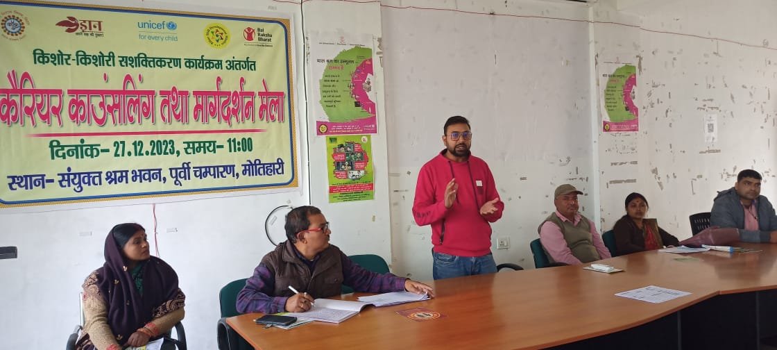 मोतिहारी ( 27.12.2023) को संयुक्त श्रम भवन पूर्वी चंपारण मोतिहारी के सभागार में किशोर- किशोरी सशक्तीकरण कार्यक्रम अंतर्गत करियर काउंसलिंग तथा मार्गदर्शन मेला का आयोजन किया गया। करियर काउंसलिंग सह मार्गदर्शन मिला का उद्घाटन जिला नियोजन पदाधिकारी मुकुंद माधव द्वारा किया गया। यह कार्यक्रम महिला एवं बाल विकास निगम, समाज कल्याण विभाग यूनिसेफ के सहयोग से बाल रक्षा भारत सेव द चिल्ड्रेन द्वारा संचालित उड़ान परियोजना के तहत आयोजित किया गया।