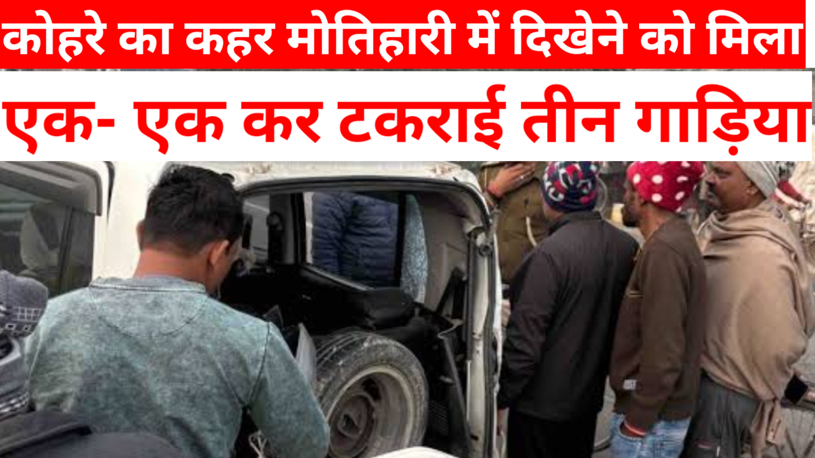 मोतिहारी के छतौनी थाना क्षेत्र में सरकारी बस स्टैंड के पास घने कोहरे के कारण चार वाहनों के बीच एक दुर्घटना हुई। इसमें एक वैगनआर कार बुरी तरह क्षतिग्रस्त हो गई, लेकिन कार में सवार लोग सुरक्षित हैं। बताया जा रहा है कि एक बस के पीछे कार चल रही थी, तभी पीछे से आ रहे अनियंत्रित ट्रक ने बस को टक्कर मार दी। इसके बाद ट्रक ने कार को भी टक्कर मार दी।