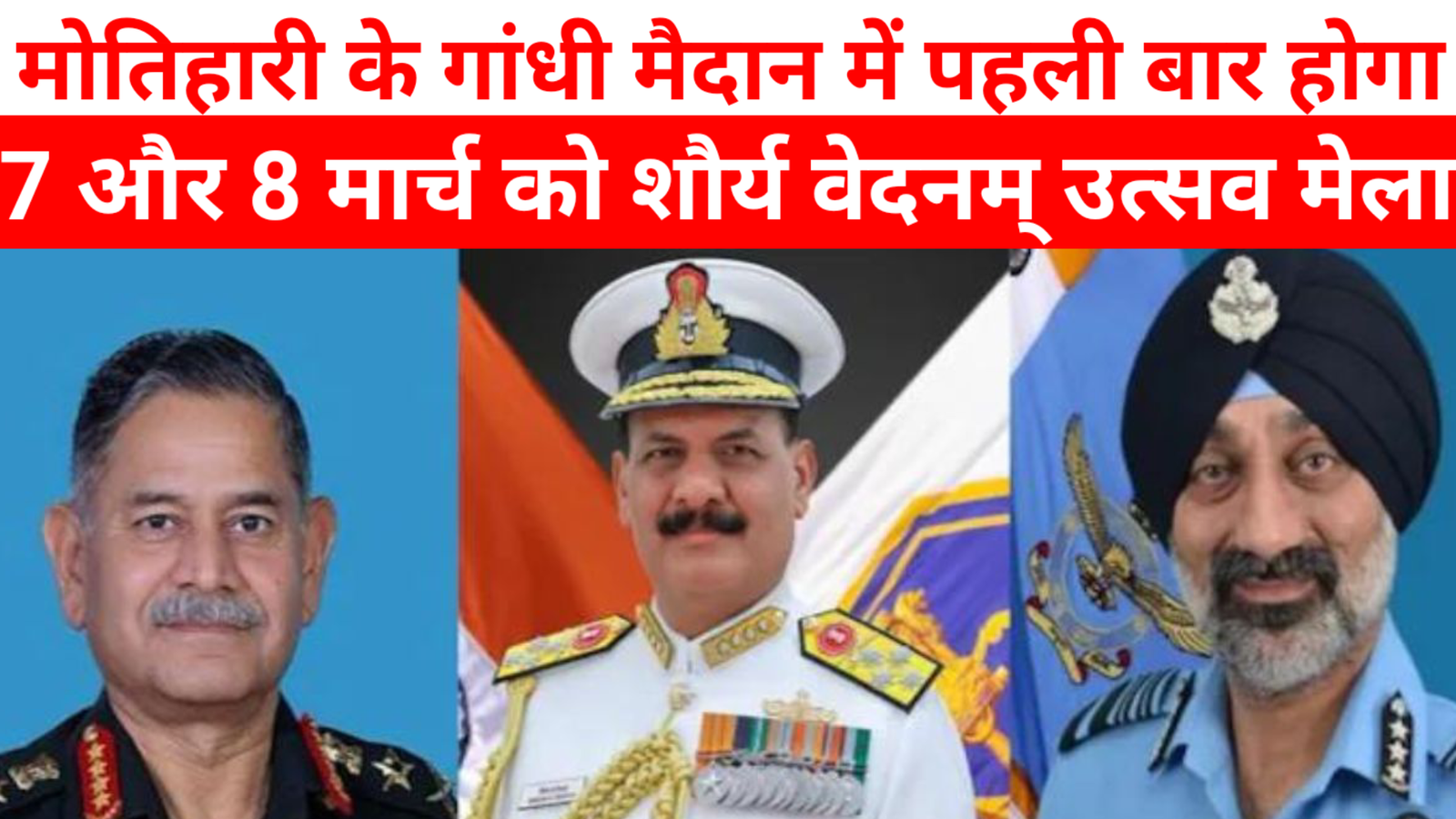 मोतिहारी: बिहार में पहली बार, गृह विभाग के तत्वावधान में “शौर्य वेदनम्” उत्सव मेले का आयोजन किया जा रहा है। यह भव्य आयोजन 7 और 8 मार्च को मोतिहारी के ऐतिहासिक गांधी मैदान में संपन्न होगा। इस मेले में भारतीय थल, वायु और जल सेना के जांबाज जवानों की उपस्थिति इसे एक विशेष पहचान देगी।