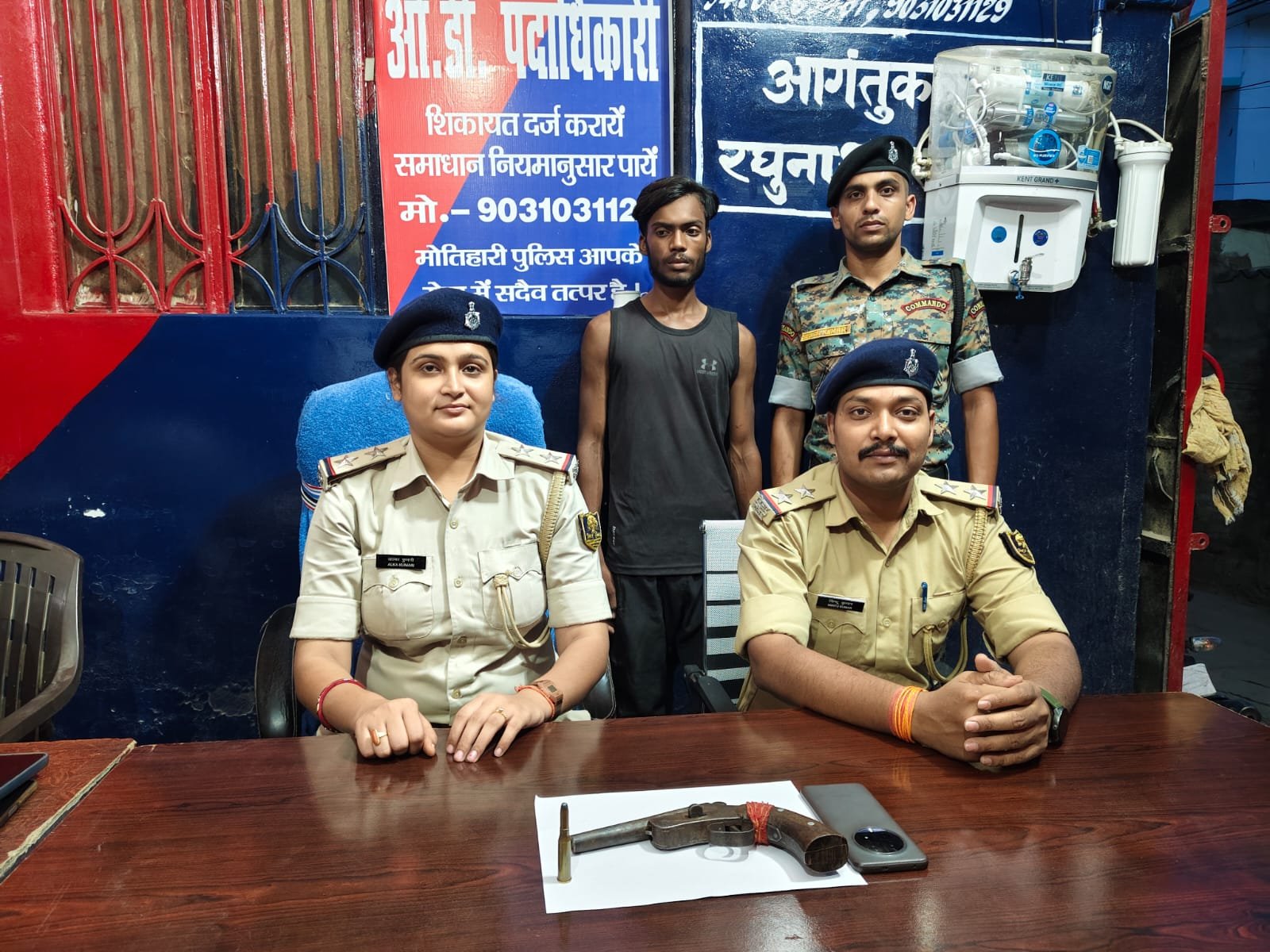 पूर्वी चंपारण जिले के रघुनाथपुर थाना क्षेत्र अंतर्गत पुलिस को एक बार फिर गुप्त सूचना के आधार पर बड़ी सफलता मिली है। अवैध हथियार के साथ एक युवक को गिरफ्तार कर लिया गया है। पुलिस ने उसके पास से एक देशी कट्टा, एक जिंदा कारतूस, एक मोटरसाइकिल और एक मोबाइल फोन बरामद किया है।