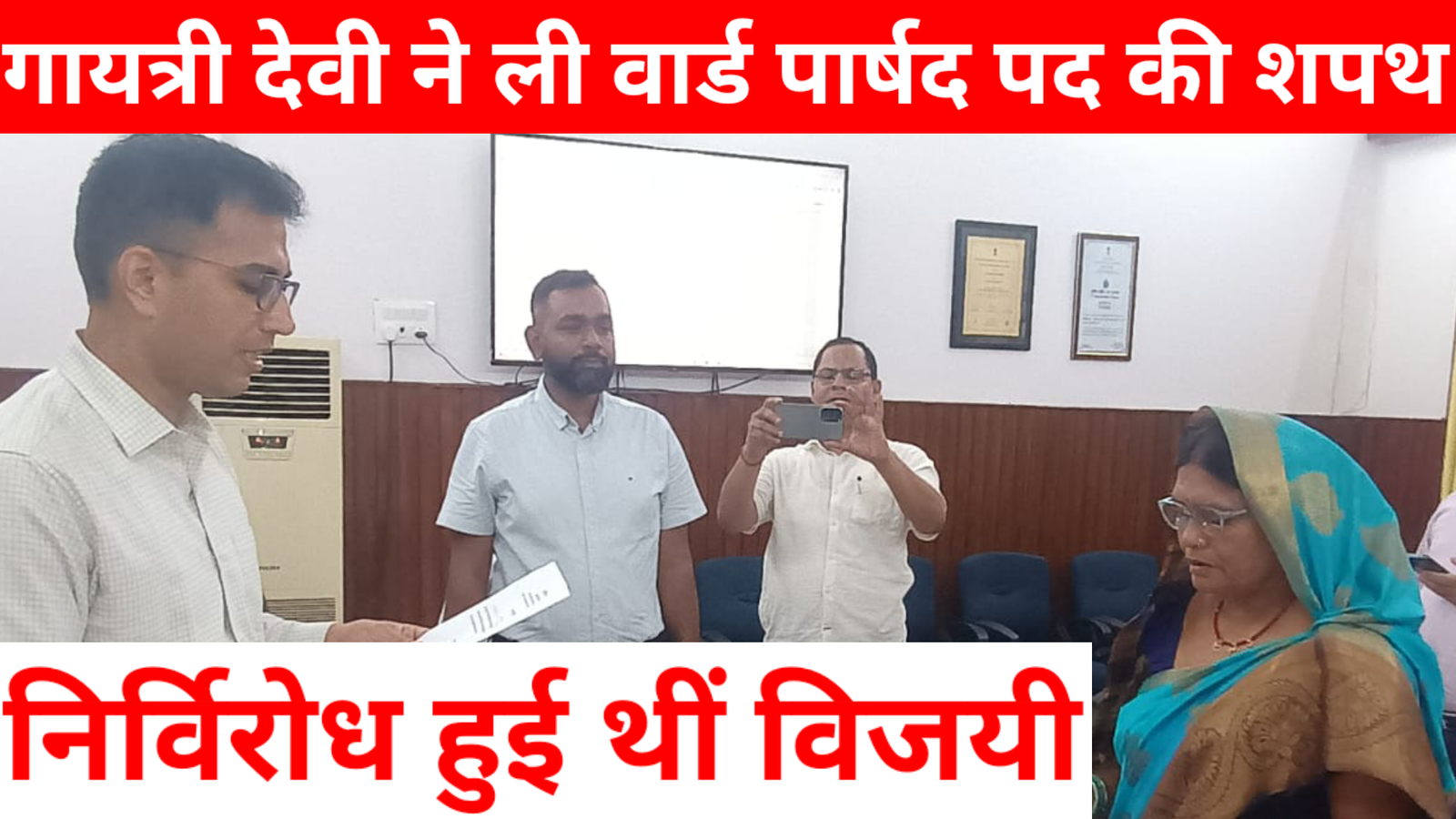 मोतिहारी नगर निगम के वार्ड संख्या 6 से निर्विरोध निर्वाचित हुईं गायत्री देवी ने आज विधिवत रूप से वार्ड पार्षद पद की शपथ ग्रहण की। शपथ ग्रहण का यह कार्यक्रम जिलाधिकारी सह जिला निर्वाचन पदाधिकारी (नगर पालिका) सौरभ जोरवाल के कार्यालय कक्ष में सम्पन्न हुआ।