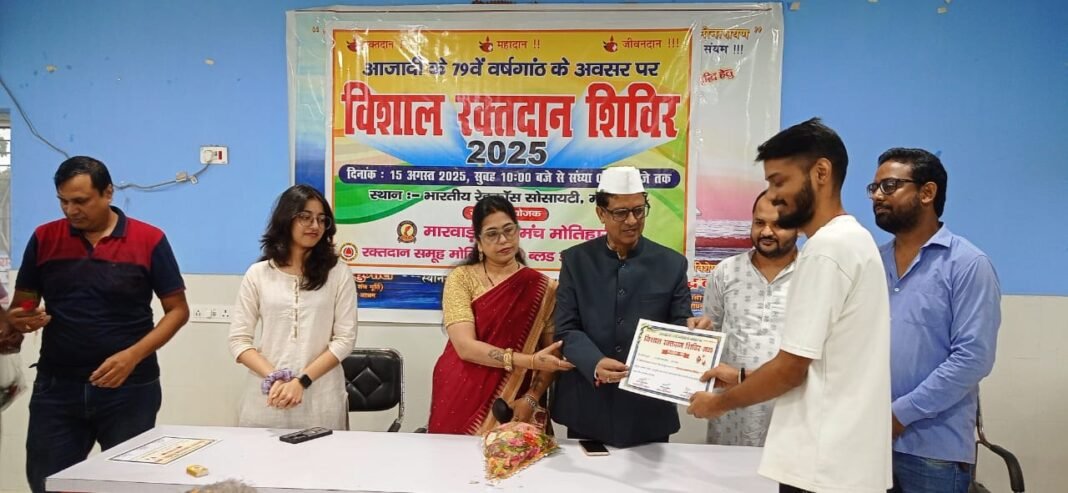 मोतिहारी। स्वतंत्रता दिवस-2025 के शुभ अवसर पर मारवाड़ी युवा मंच मोतिहारी, रक्तदान समूह मोतिहारी एवं ब्लड डोनर ग्रुप मोतिहारी के संयुक्त तत्वावधान में स्थानीय रेडक्रॉस भवन मोतिहारी में शुक्रवार को एक विशाल रक्तदान शिविर का आयोजन किया गया। इस अवसर पर देशभक्ति और मानव सेवा की अद्भुत मिसाल पेश करते हुए बड़ी संख्या में युवाओं ने रक्तदान कर समाज को जीवनदायी संदेश दिया।