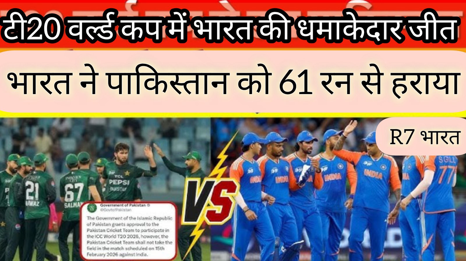 ICC Men’s T20 World Cup के रोमांचक मुकाबले में भारत ने शानदार प्रदर्शन करते हुए पाकिस्तान को 61 रन से करारी शिकस्त दी। हाई-वोल्टेज मुकाबले में भारतीय टीम ने पहले बल्लेबाजी करते हुए निर्धारित 20 ओवर में 7 विकेट के नुकसान पर 175 रन का मजबूत स्कोर खड़ा किया। जवाब में लक्ष्य का पीछा करने उतरी पाकिस्तान की टीम भारतीय गेंदबाजों के सामने टिक नहीं सकी और 18 ओवर में 114 रन पर सिमट गई।