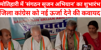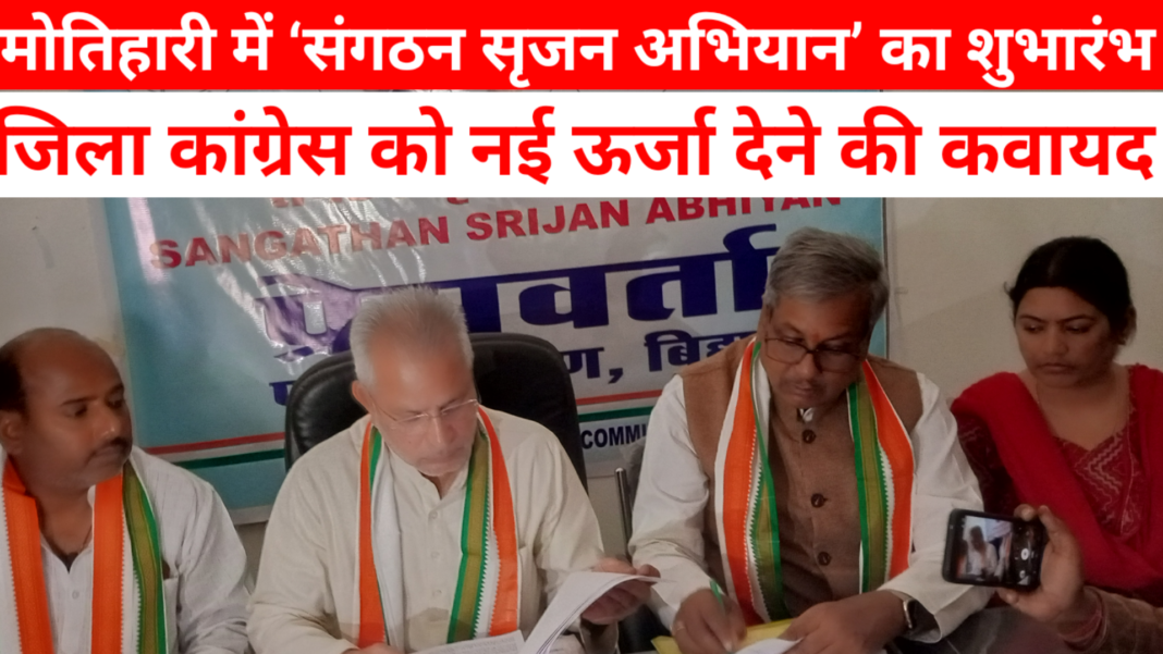 मोतिहारी, 21 फरवरी 2026: जिला कांग्रेस कार्यालय, गांधी आश्रम बंजरिया पंडाल में शनिवार को “संगठन सृजन अभियान” का विधिवत शुभारंभ किया गया। कार्यक्रम की शुरुआत अध्यक्ष सह पूर्व विधायक हिम्मत सिंह पटेल तथा जिला कांग्रेस कमिटी के अध्यक्ष ई० शशि भूषण राय उर्फ गप्पू राय के नेतृत्व में हुई। इस अवसर पर पार्टी पदाधिकारी, कार्यकर्ता और कई वरिष्ठ नेता उपस्थित रहे।